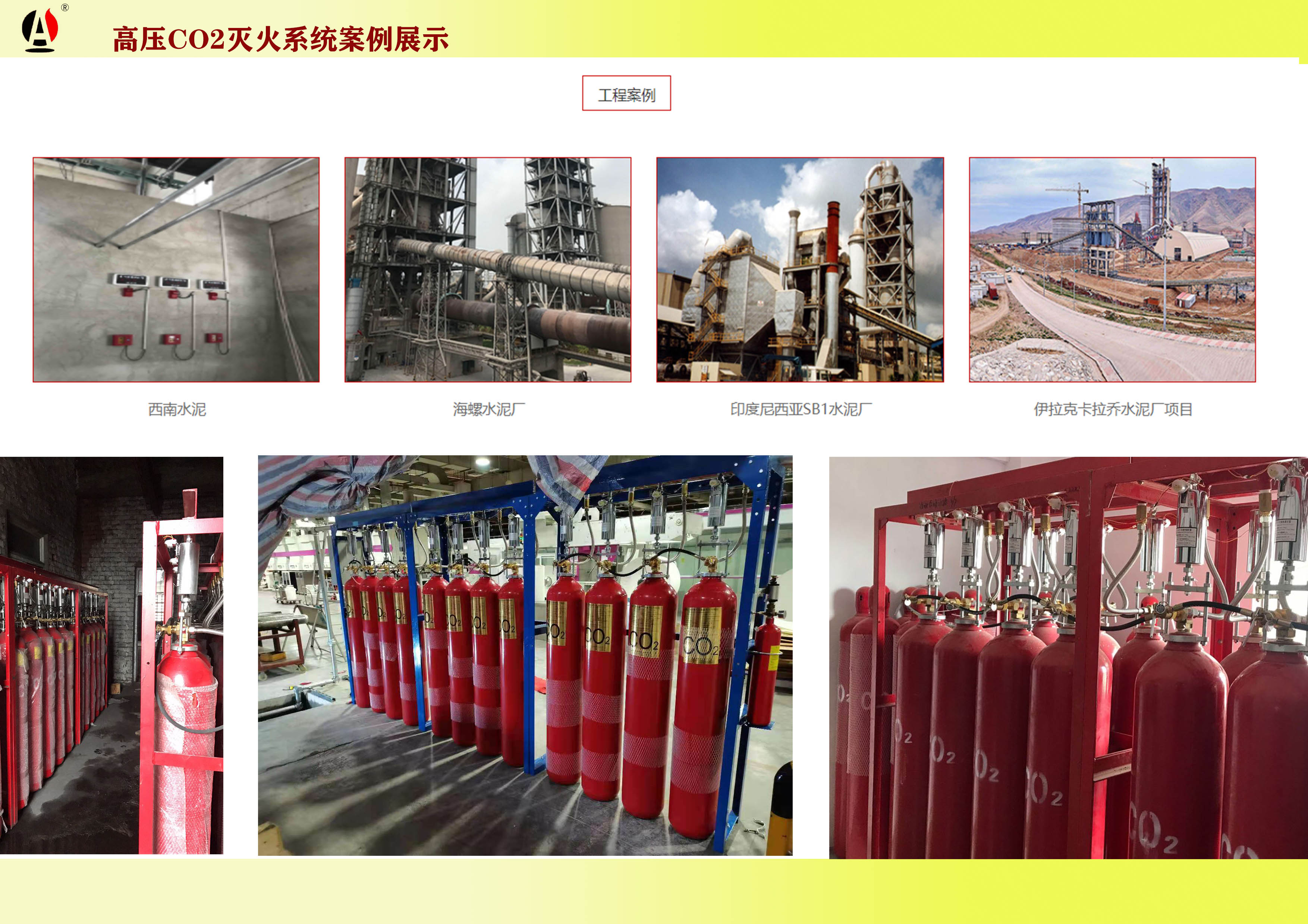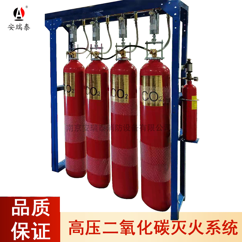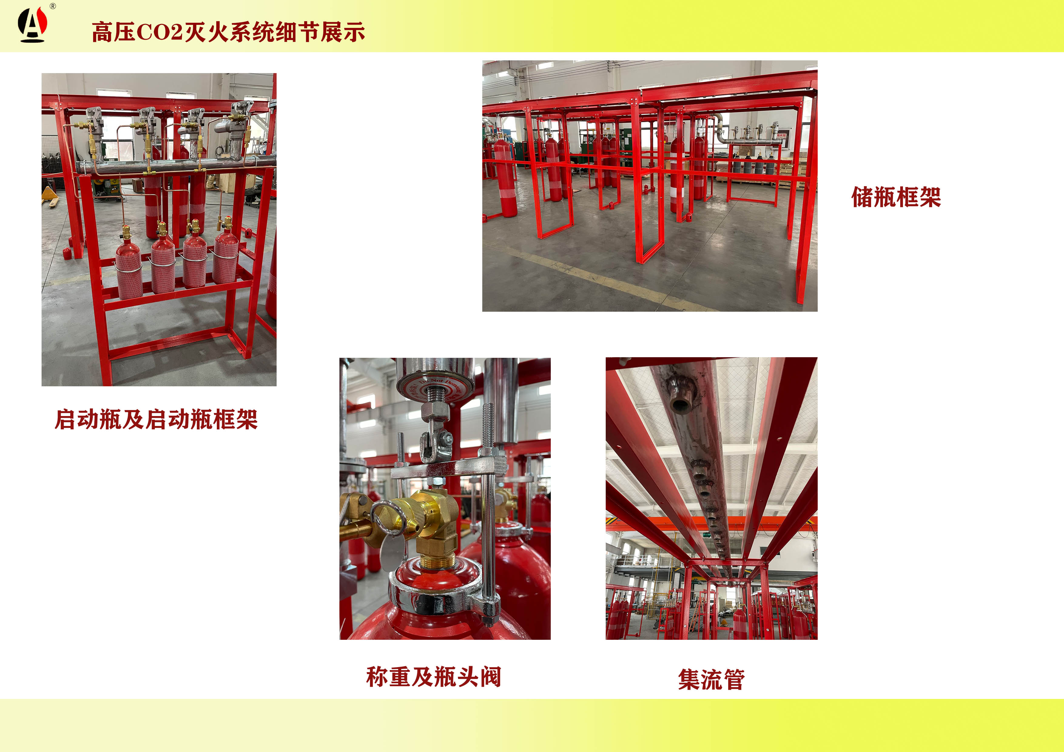 二氧化碳滅火系統(tǒng)由滅火劑儲存瓶組、稱重裝置、液體單向閥、連接管、集流管、安全閥、壓力信號器、驅動氣體儲存瓶組、氣體單向閥、選擇閥、管網、噴頭及自動滅火控制器等部件組成。